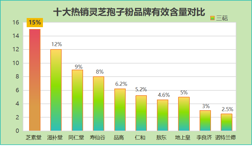 1 芝素堂破壁灵芝孢子粉;市场上少见的的高三萜含量品牌——芝素堂破壁灵芝孢子粉,以其15%的三萜含量闻名。产品获得国食健字号认证,源自营养价值极高的泰山赤灵芝菌种,种植地位于清新的泰山地区,采用仿野生种植技术,不打农药,人工捉虫,加以山泉水灌溉,并且拥有国食健字号,保证其产品质量和安全。