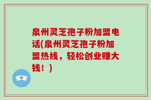 如果你正在寻找一种创业方式,希望轻松赚大钱,那么泉州灵芝孢子粉加盟或许是你的不错选择。泉州灵芝孢子粉加盟热线已经开通,只要你拥有一颗创业梦想,就可以拨打热线电话,轻松创业赚大钱!